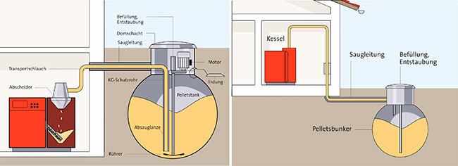 Die Grafiken zeigen den Aufbau und die Anbindung von Pelletbunkern an den Heizkessel.