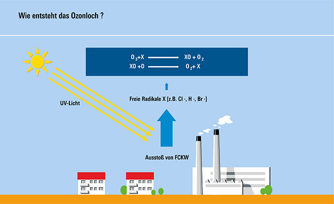 Infografik zur Entstehung des Ozonloches. Von der Sonne gelangt UV-Licht zur Erde. Gleichzeitig leitet der Mensch FCKW Gase in die Umwelt, die dann in die Stratosphähre aufsteigen und dort von den UV-Strahlen gespalten werden. Dabei werden sogen. Radikale freigesetzt, die die Ozonschicht schädigen. Kunde: DENA